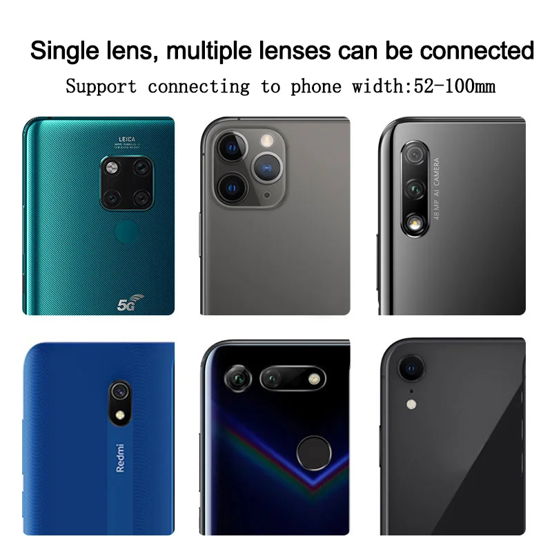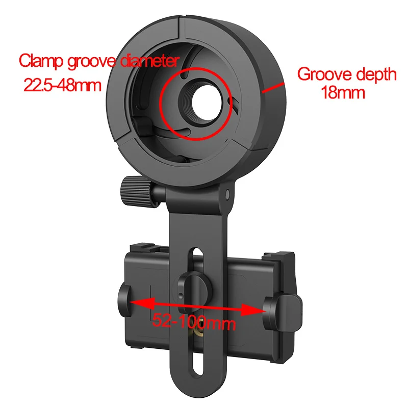(6) Conexión de bayoneta ocular: Compatible con telescopio cuyo diámetro exterior del ocular está entre 22,5-48mm, adecuado para teléfonos móviles con un ancho de 52-100mm, como Huawei, Samsung, apple, Xiaomi, etc.