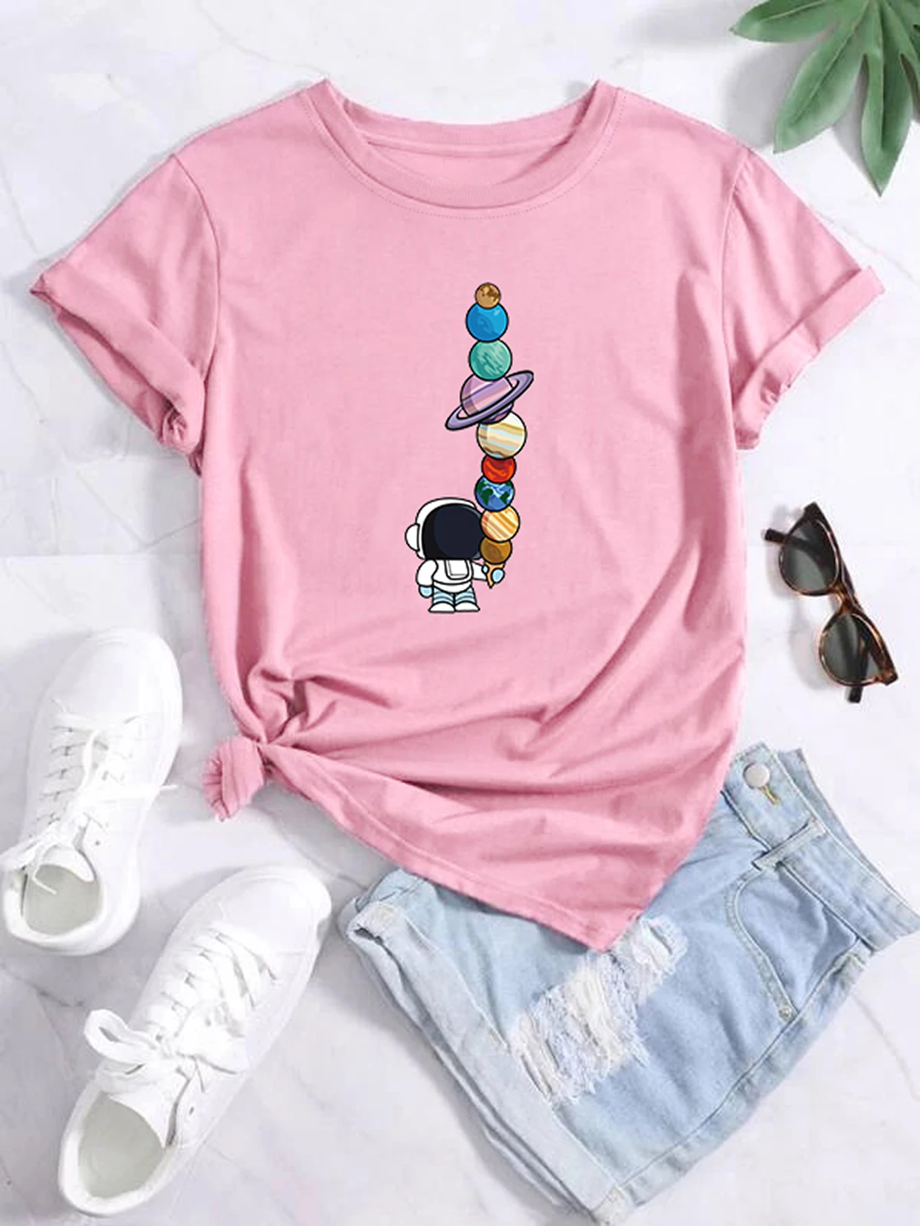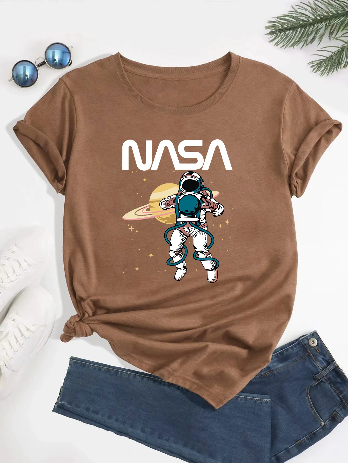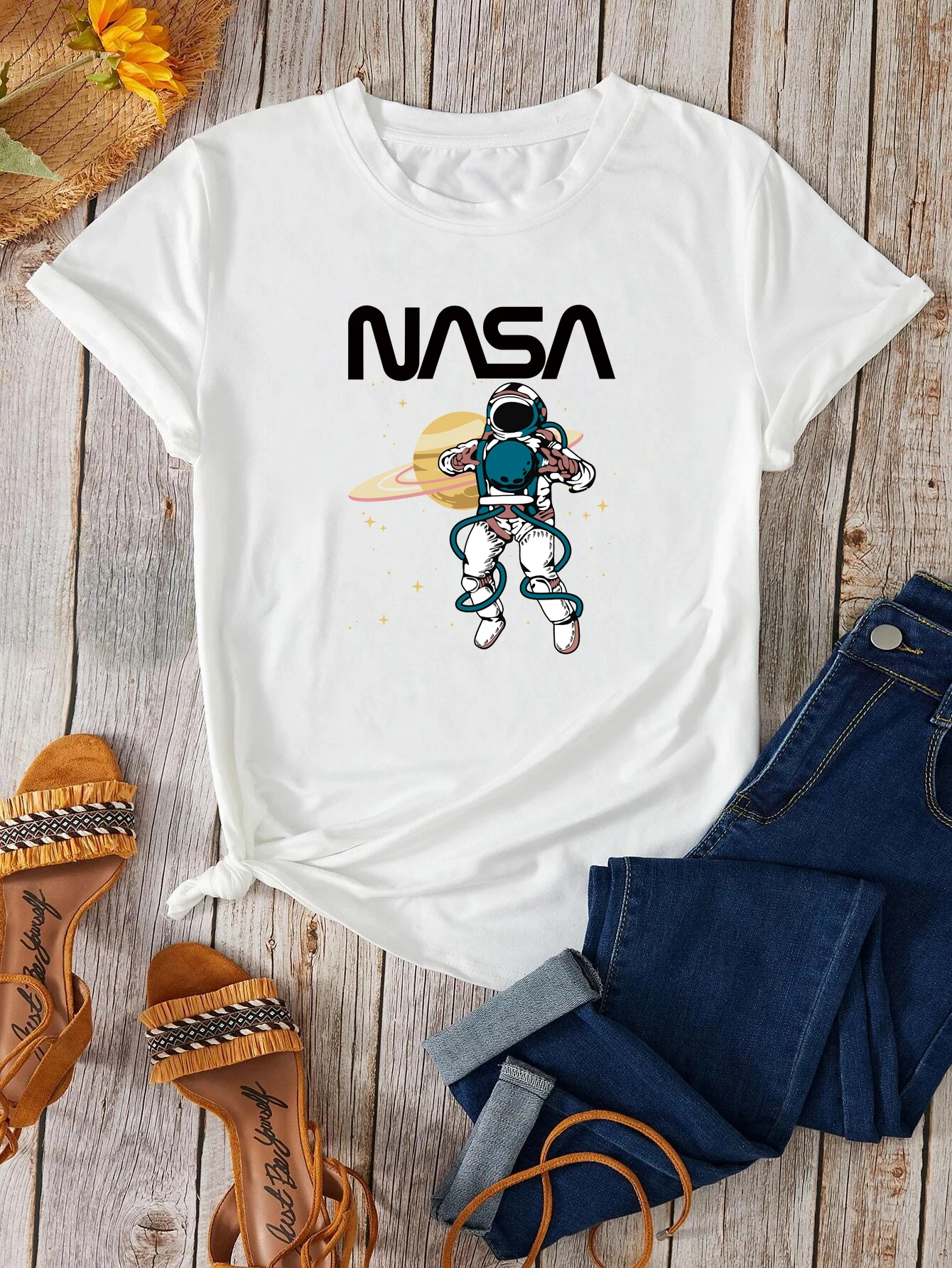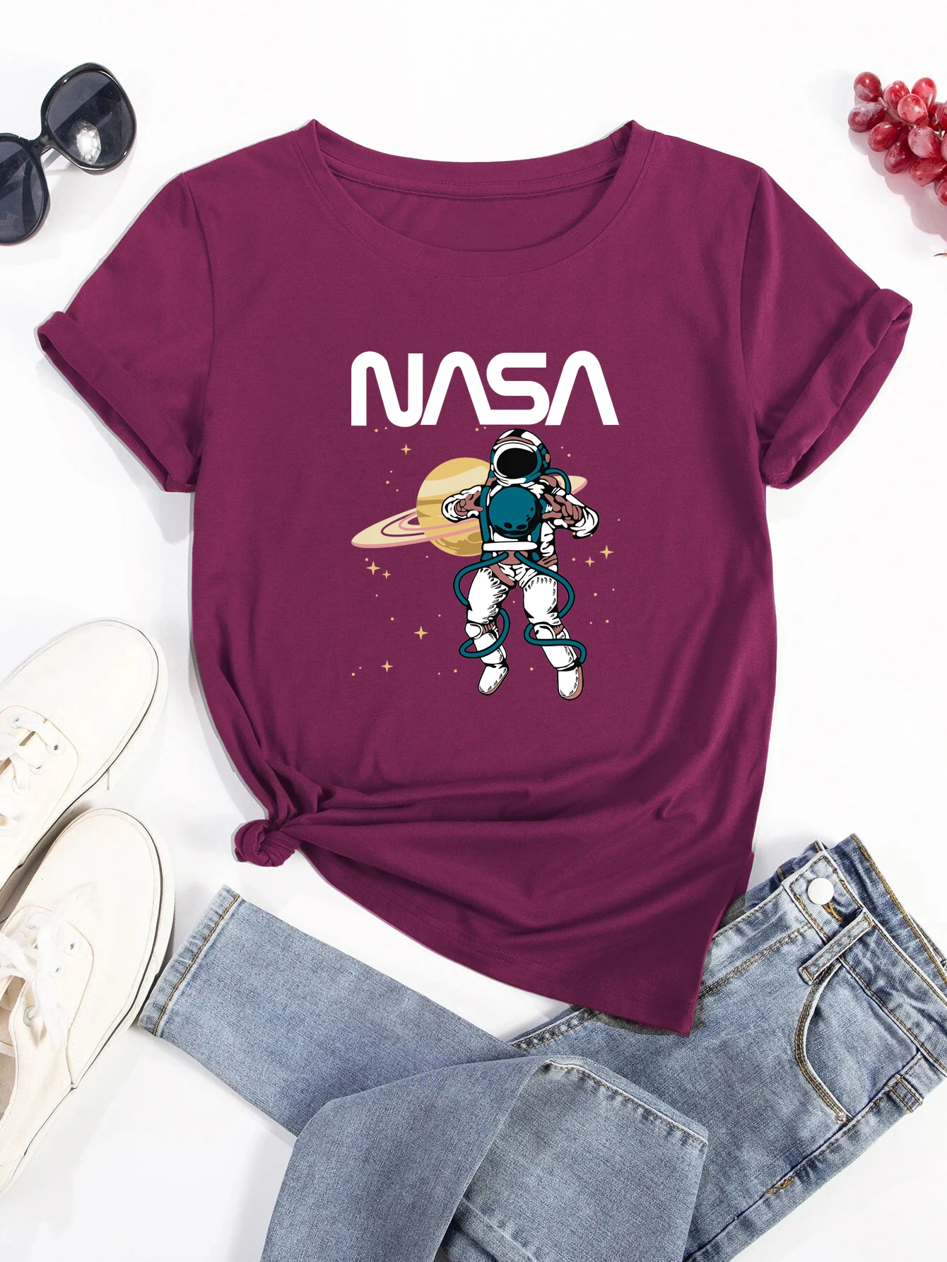Camiseta de cuello redondo con estampado de La NASA, camiseta de manga corta, camiseta informal de cuello redondo elástico ligero para mujer, camisetas de verano