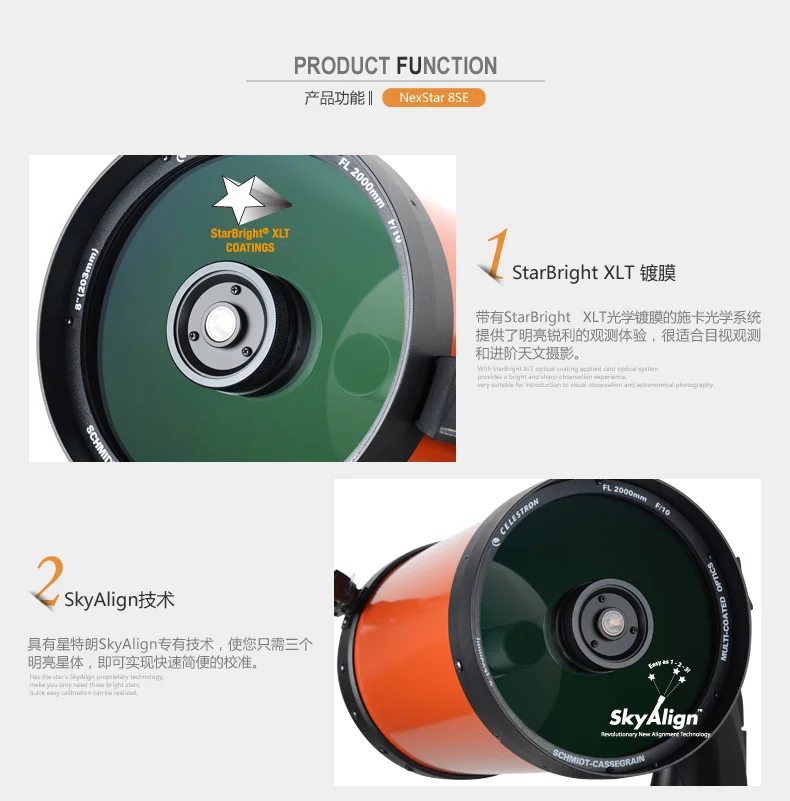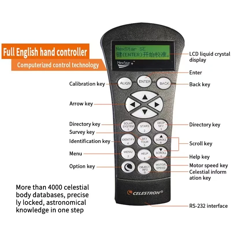 Marca: CelestronSistema óptico: Sistema Cassegrain SchmidtDiámetro: 203,2mm (8 “)Distancia focal: 2000mmRelación focal: 10Espejo Buscador de Estrellas: Espejo Buscador de EstrellasSoporte: teodolito de un solo brazoBarril de lente principal óptico: AluminioOcular: 25mm (81,28x)-1-1/4″Espejo Zenith: 1,25″Trípode: AceroCD-ROM:NexRemote V1.6.14 & The Sky L1Magnitud límite: 14Revestimiento óptico: StarBright XLTBases de datos: Más de 40000
