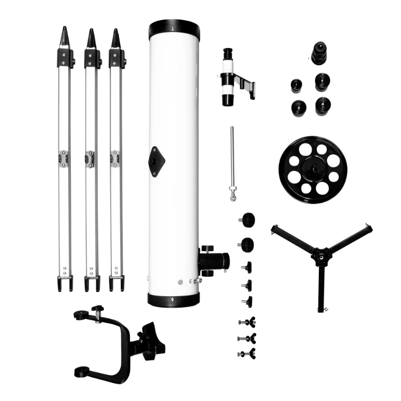 Incluye espejo primario acromático de 76mm, 3 oculares estándar de EE. UU. de 1,25 ‘, 3x lentes Barlow, erector de imagen 1.5x y visor de 5x24mm.